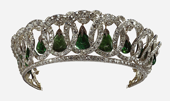 Inherited by The Queen in 1953, the tiara is unusual in that it can be worn in a variety of ways, as its pendant emeralds can be removed or substituted for pearls.