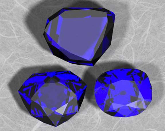 The computer models, above, depict the history of the Hope Diamond, including (counterclockwise from top) the Tavernier, the French Blue and the Hope Diamond.