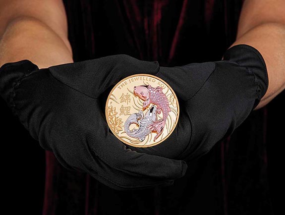 Two shimmering koi — one embellished with 78 Argyle Pink Diamonds hand-set in 18-karat rose gold and the other fashioned from 80 white diamonds hand-set in 18-karat white gold — seem to slither upon the surface of The Perth Mint’s latest 3D “Jewelled” coin. Each fish has two Argyle golden diamonds for eyes.